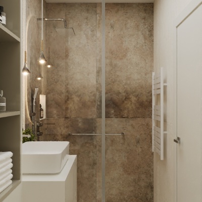 Living room with kitchen, 1 bedroom, Bathroom with shower, Clean modern style