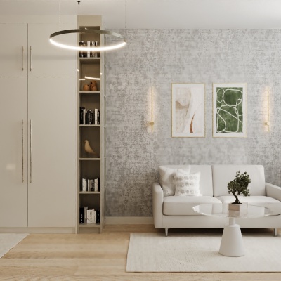 Living room with kitchen, 1 bedroom, Bathroom with shower, Clean modern style