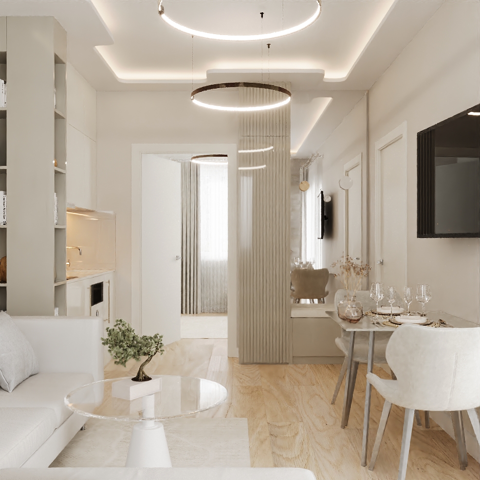 Nappali konyhával, 1 db hálószoba, Mosdó zuhanyzóval, Letisztult stílusú